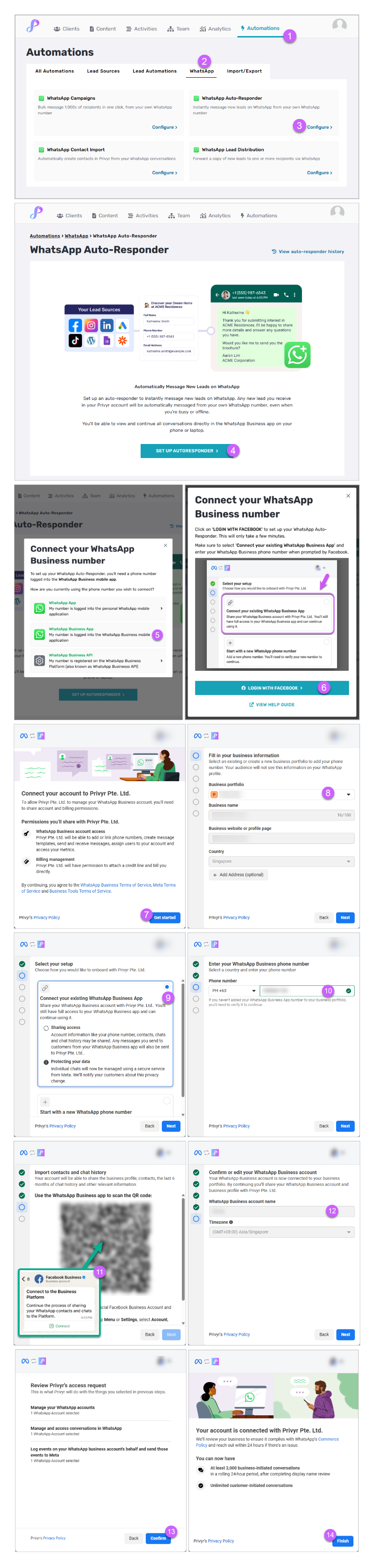 To use the WhatsApp Auto-Responder, connect your WhatsApp Business number to Privyr using your Facebook account. The setup process takes around 5-10 minutes.