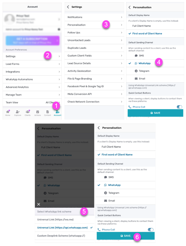 - Custom Deeplink Scheme (whatsapp://): this will open WhatsApp Business by default (then prompt to either Message or ‘Open in WhatsApp’)